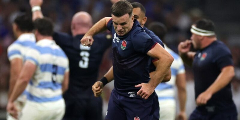 MARSEILLE, FRANCE - SEPTEMBER 09: George Ford of England celebrates after kicking his first of three drop goals during the Rugby World Cup France 2023 Group D match between England and Argentina at Stade Velodrome on September 09, 2023 in Marseille, France. (Photo by David Rogers/Getty Images)